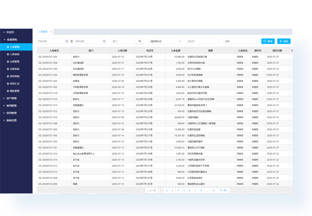 资产管理主要针对固定资产的购置、验收、领用、清查和处置,货币资金的支取领用等全流程管理。加强固定资产管理,提高资产的使用效率,确保固定资产的完整性。按照管理的科学化、规范化和精细化的要求,对资产的入库,领用出库明细记录,确保低值易耗品的安全性,避免被盗窃、挪用或丢失。