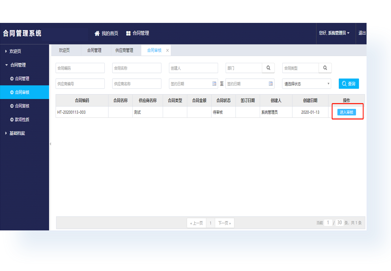 • 合同管理系统属于内控管理系统下的系统,点击进入后能够独立进行运行
